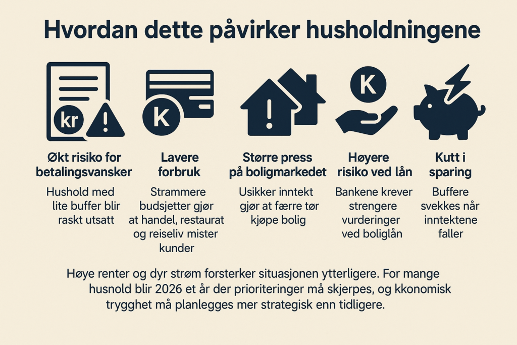 - Økt risiko for betalingsvansker: Hushold med lite buffer blir raskt utsatt.