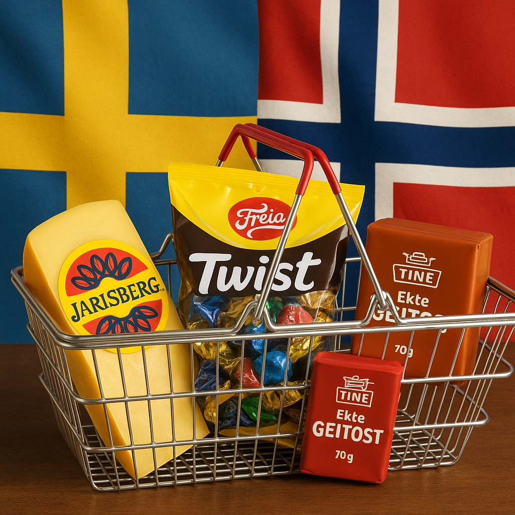 Norske varer som Jarlsberg, Fløtemysost, Grilstad-salami og Freia Twist er billigere i Sverige enn i Norge.