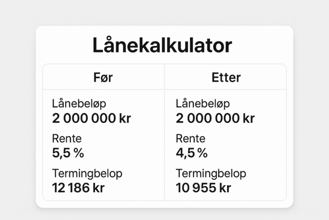 Basert på nominell rente 10,10 % og effektiv rente 10,86 %. Eksempel: 300 000 kr over 10 år → kostnad 181 338 kr → totalt 481 338 kr. Faktiske kostnader kan variere noe.